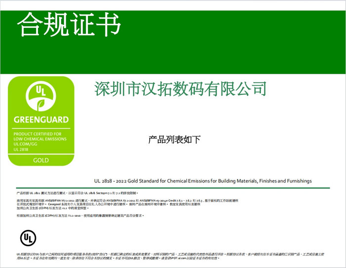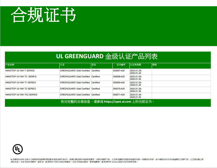 在全球可持續發展浪潮與制造業綠色轉型需求的同頻共振下,UV打印機國內高端品牌漢拓數碼再次以核心實力贏得國際認可。公司旗下多款UV墨水成功通過全球嚴苛的環保認證之一:UL 綠色衛士金級認證(UL GreenGuard GLOD )。