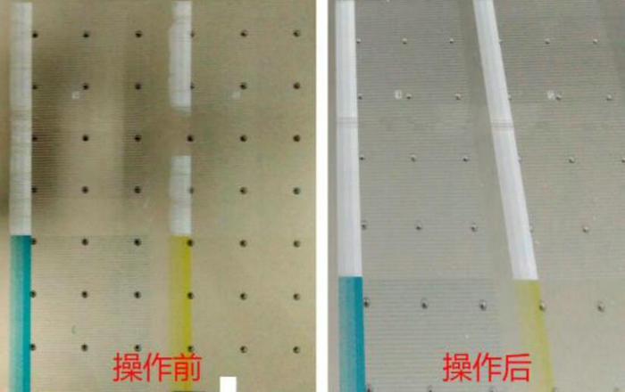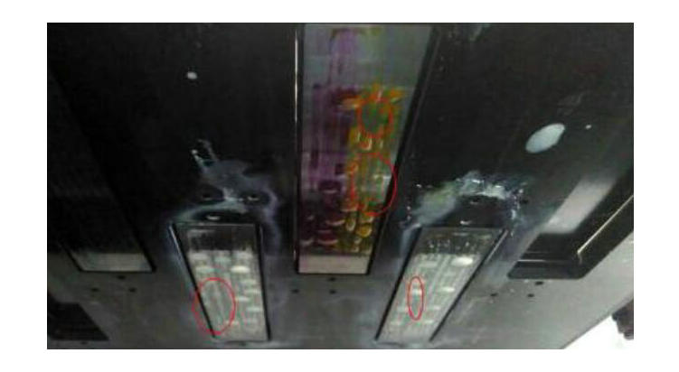 1. 壓墨發現局部噴嘴墨水很難出來。如下圖,紅色圈起來的地方,壓墨時墨水難出來,而其它地方良好。這是噴嘴表面干燥造成的??梢杂眠厜耗叢羾娮斓姆椒?,用壓出的墨水濕潤堵塞的孔。在操作過程中,需要注意必須使用細軟的無塵布,視噴頭表面干燥情況可適當沾上清洗液擦拭,不要直接用干布擦拭,避免損壞UV打印機的噴頭。