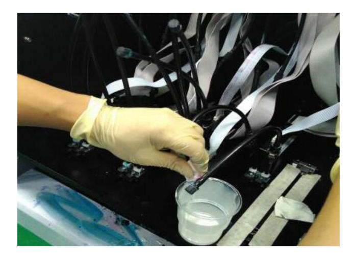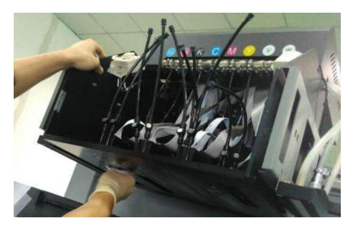 3. 彩墨或者白墨打狀態部分孔發虛。確認溫度電壓波形正確后,可使用高壓的方法。但前提是執行了上述兩個步驟仍沒有效果,才可以使用高壓的辦法。關閉清噴,不需要降低負壓。以強壓淺紅為例,如下圖,把UV打印機所有墨閥關閉,右手拿墨閥按上需要強壓墨的噴頭上,隨時準備開閥,左手按壓墨按鈕5秒,然后右手開墨閥 1 秒,再左手松開壓墨。最后擦干凈噴頭,打狀態條查看。
