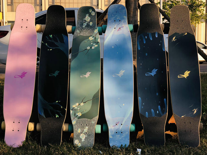 滑板主要是由板面、橋(支架)、輪子、軸承、砂紙等組成。而板面是滑板辨識度最高的部分,不同的板面材質和圖案帶給人不同的感官體驗。現在的很多的玩具滑板,主要也是靠“顏值”獲得了不錯的市場銷量,甚至超過專業滑板。那也是為什么滑板廠商越來越重視板面圖案的設計和制作,也讓UV平板打印機這種換圖靈活、無需制版、即打即干的工具應用到產品制作過程中。
