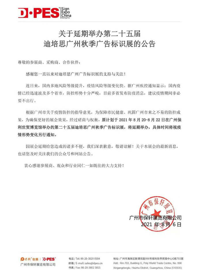 根據(jù)廣州市關(guān)于疫情防控的指導(dǎo)意見,為保障市民健康、鞏固廣州市來之不易的防控成果,為確保更好的展會(huì)效果,主辦方?jīng)Q定原計(jì)劃于2021年8月20-8月22日在廣州保利世貿(mào)博覽館舉辦的第二十五屆迪培思廣州秋季廣告標(biāo)識(shí)展,將延期舉辦,具體時(shí)間將視疫情形勢變化另行通知。
