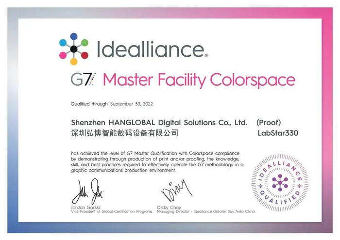 近日,UV打印機高端品牌漢拓數碼兄弟公司弘博智能工業級數字標簽機LabStar 330獲得了美國IDEAlliance(國際數碼企業聯盟)頒發的G7認證最高級別認證證書—G7 ColorSpace級別,成為國內首臺通過G7最高級別認證的數字噴墨標簽機。弘博智能也因此成為中國數字噴墨印刷設備領域鮮有的獲得G7最高級別認證的設備廠商。