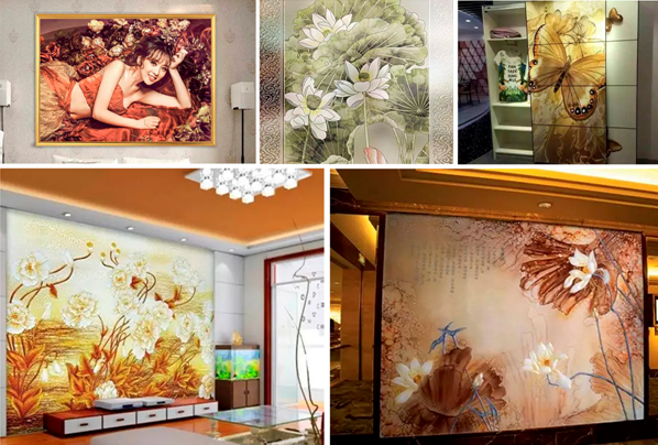 UV打印在家裝玻璃上,結合其它工藝,如蝕刻、雕刻、冰花,可以做出豐富多樣的彩繪藝術玻璃效果。配合燈光,使一個家熠熠生輝,溫馨浪漫。可作移門、電視背景墻、餐廳背景墻、屏風、吊頂等。只要客戶想的到的,手機照片、藝術作品都可以通過UV數碼打印技術展現在玻璃上。